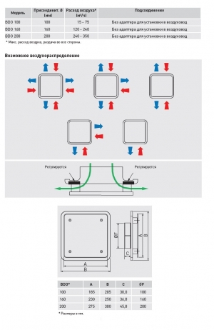 При использовании в приточных системах возможна настройка направления и длины струи.
