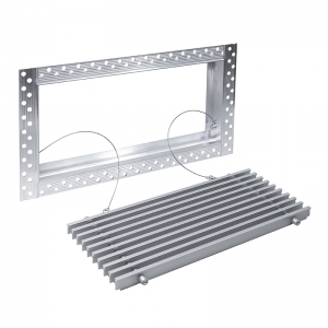 Данная решетка подходит для монтажа на любую поверхность под финишную отделку. Рамка и экран изготовлены из алюминия, опора экрана - из оцинкованной стали. Рама оснащена «полкой» 1,9 мм и рифлеными краями для большей адгезии финишного материала – шпатлевки, цемента. Решетка имеет съемную центральную часть с фиксированным углом наклона ламелей 0°. Она крепится к корпусу прочными металлическими тросиками, легко снимается для очистки и удобного обслуживания.