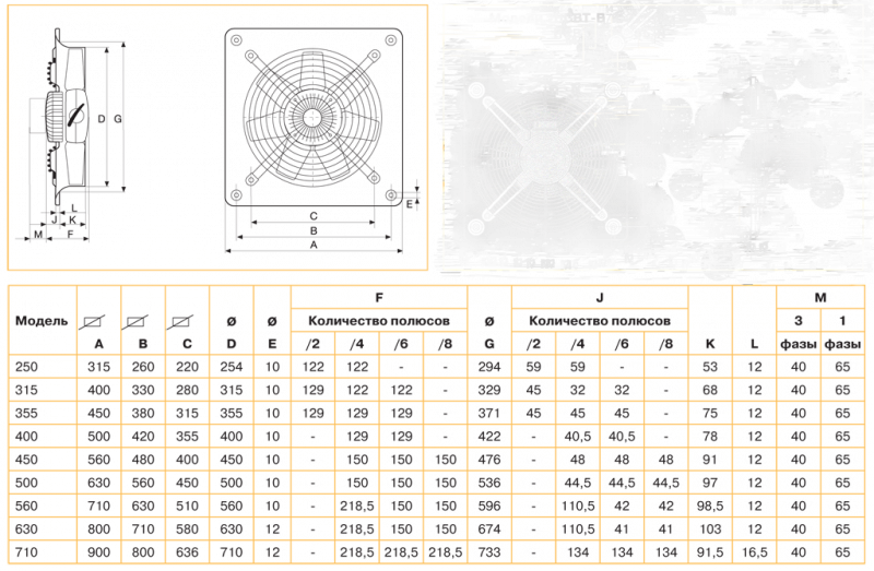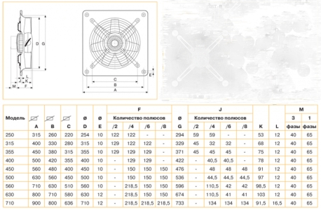 В зависимости от модели, вентиляторы комплектуются 2, 4, 6 или 8 полюсными однофазными электродвигателями.