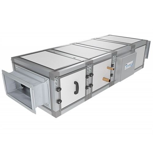 Приточная установка с электрическим нагревателем (при заказе возможен выбор различных мощностей нагревателя) и френовым охладителем (требуется ККБ), комплектуется воздушным клапаном с электроприводом, системой цифровой автоматики JetLogic с цветным сенсорным пультом управления и всеми необходимыми датчиками. Автоматика может управлять различными типами ККБ. Вентилятор Ebmpapst серии EC (произведен в Германии)Функции автоматики