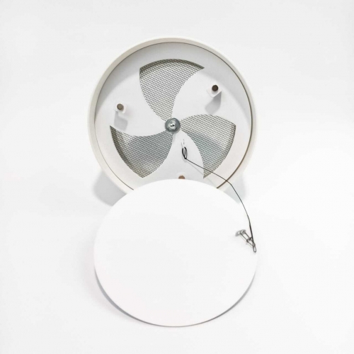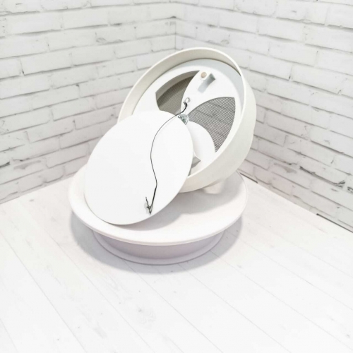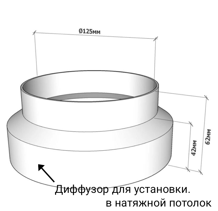 Диффузор состоит из пластикового перехода, металлической заслонкой, которой можно регулировать поток воздуха, либо полностью перекрыть его. К заслонке с помощью магнитов крепится декоративная круглая панелька, которую можно покрасить в цвет потолка. Так же по ободку диффузора имеется надёжный двухсторонний скот марки 3М, к которому крепится полотно натяжного потолка. Наши диффузоры оснащены москитной сеточкой, которая препятствует попаданию насекомых в помещение.