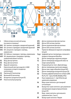 - Возможные опции WT температура воздуха по температуре воды PW дополнительный водяной калорифер CF дополнительный охладитель и управление ККБ DS диспетчеризация.